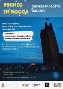 Giovedì 29 agosto la quinta edizione del Pic Nic in Rocca con Osservazione Astronomica sul prato della Torre di Federico II. Alle 19:30 il picnic al costo di 15.00€ che include il cestino. Portare un telo per il picnic sull’erba!