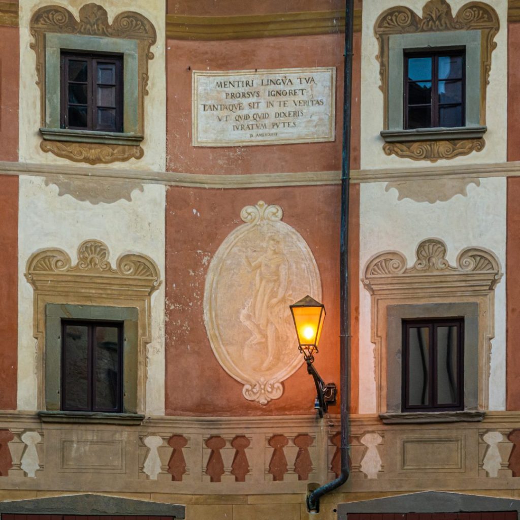 I motti riportati sulla facciata spesso indicano il nome dell’autore, anche se in alcuni casi il nome dipinto non corrisponde al vero autore della frase o è andato perduto. Questo fenomeno è probabilmente legato al deterioramento della facciata avvenuto verso la fine dell’Ottocento, che ha causato la scomparsa di alcuni nomi e il danneggiamento di altri. Durante i restauri del Novecento, alcuni dettagli potrebbero essere stati erroneamente modificati.