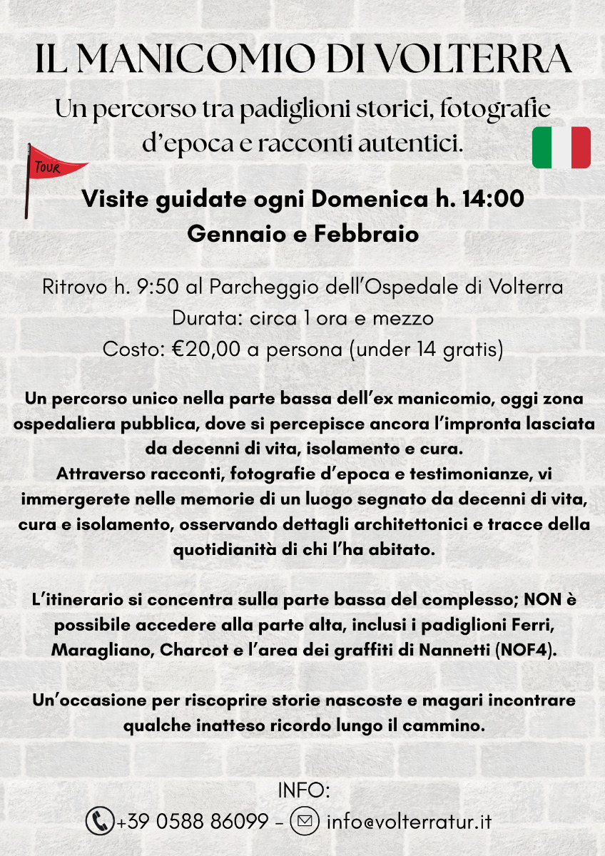 L’ex manicomio è accessibile la domenica di gennaio e febbraio alle ore 14.00 con visite guidate che includono la parte bassa con i padiglioni Ferri, Maragliano e Charcot e l’area NOF dei graffiti di Nannetti Oreste Fernando.