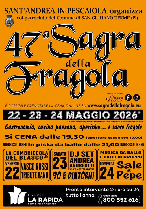 The traditional strawberry fair, held for 47 years in the village of Sant’Andrea in Pescaiola, takes place from 22nd to 24th May.