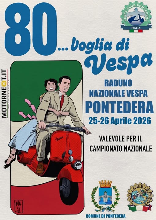 Pontedera celebrates the 80th anniversary of the Vespa with a major national gathering on 25-26th April, called ‘80 voglia di… Vespa’ (80 years of Vespa). The 2026 edition takes on symbolic value, marking the start of celebrations for the 80th anniversary of the Vespa, which was launched in 1946 and has become an international icon, an expression of Italian style, innovation and identity. Pontedera is the city where the history of the Vespa took shape and is therefore the ideal setting to pay tribute to it.