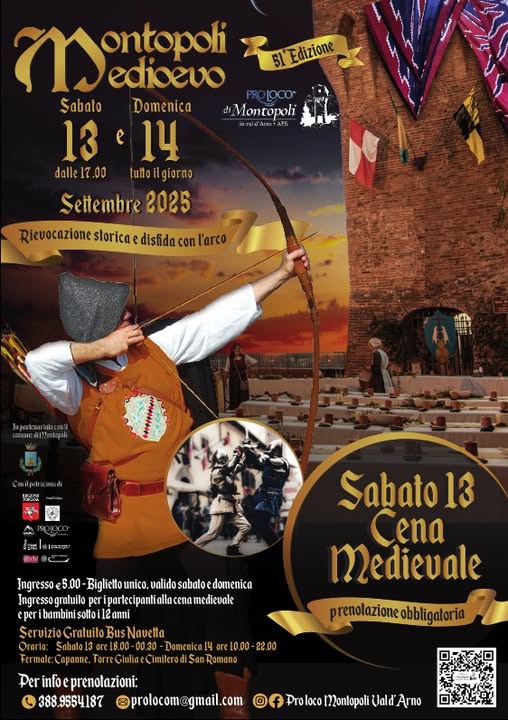 Da 51 anni a Montopoli in Valdarno si celebra il secondo sabato e domenica di settembre la rievocazione medievale della Disfida con l’arco, in cui le due contrade di Montopoli (il “perinsù” e il “peringiù”, ossia Santo Stefano e San Giovanni) si sfidano a suon di arco e frecce.