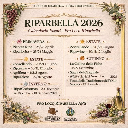 La tradizionale rassegna di appuntamenti estivi a Riparbella va da fine giugno a fine agosto, con appuntamenti prevalentemente concentrati sui prodotti di eccellenza del territorio come il vino e i piatti a base di cinghiale.