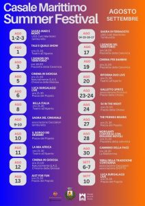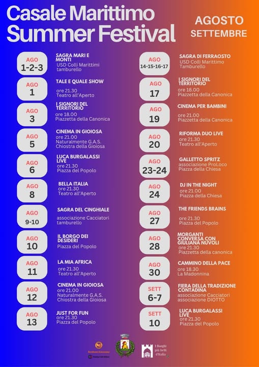 Gli appuntamenti estivi nel borgo romantico di Casale Marittimo a iniziano a fine giugno e proseguono fino a metà settembre con spettacoli in piazza, sagre gastronomiche come quella del peperoncino (5-6 luglio) e quella tradizionale della chiocciola il 26-27 luglio al campo del Tamburello, le serate Festival del Pensare (17-19 e 20 luglio) .