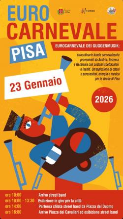 Venerdì 23 gennaio Pisa ospita per la prima volta la tappa dell’Eurocarnevale, il raduno internazionale delle Guggen Bands, 36 gruppi musicali con oltre 800 musicisti e figuranti . Si tratta di una manifestazione itinerante internazionale, che ogni anno riunisce bande musicali da Svizzera, Germania, Austria dove la tradizione della Guggenmusik è radicata.