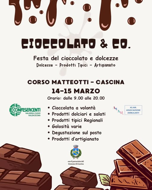 La Festa del Cioccolato sbarca di nuovo nel centro storico di Cascina. Corso Matteotti sarà animato da stand che proporranno degustazioni e vendita del ‘cibo degli dei’. Per tutta la giornata stand di artigianato, arti e mestieri, oltre a prodotti tipici.