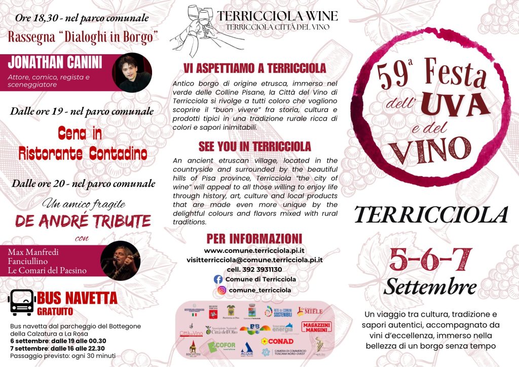 La 59ma edizione della “Festa dell’uva e del vino” di Terricciola, ritorna dal 5 al 7 settembre alla presenza di produttori vinicoli, con banchi degustazioni per le vie del paese, concerto della Filarmonica di Monterosso, apericena in Piazza XX settembre. Il programma, ricco e vario, offre intrattenimento per tutte le età, con musica, spettacoli, incontri culturali e degustazioni.