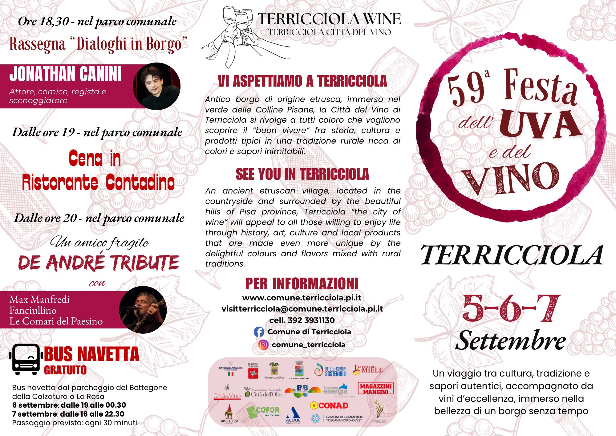 La 59ma edizione della “Festa dell’uva e del vino” di Terricciola, ritorna dal 5 al 7 settembre alla presenza di produttori vinicoli, con banchi degustazioni per le vie del paese, concerto della Filarmonica di Monterosso, apericena in Piazza XX settembre. Il programma, ricco e vario, offre intrattenimento per tutte le età, con musica, spettacoli, incontri culturali e degustazioni.