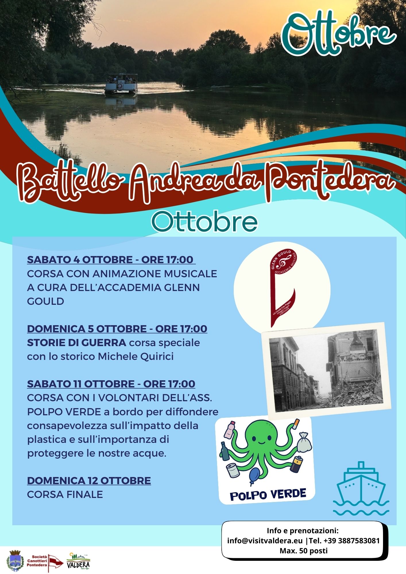 Il servizio consente di esplorare il fiume e di scoprire Pontedera da una prospettiva diversa. A bordo, animazioni musicali dal vivo, letture animate per bambini, trekking fluviale notturno con cena a La Rotta, presentazioni di libri con gli autori, concerti a bordo e visite culturali.