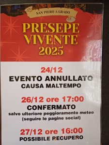 ATTENZIONE: causa maltempo la data del 24 è stata annullataResta valida(salvo ulteriori peggioramenti) la data del 26 e, a recupero di quella annullata, il 27 dicembre dalle ore 16.00 alle 18.00