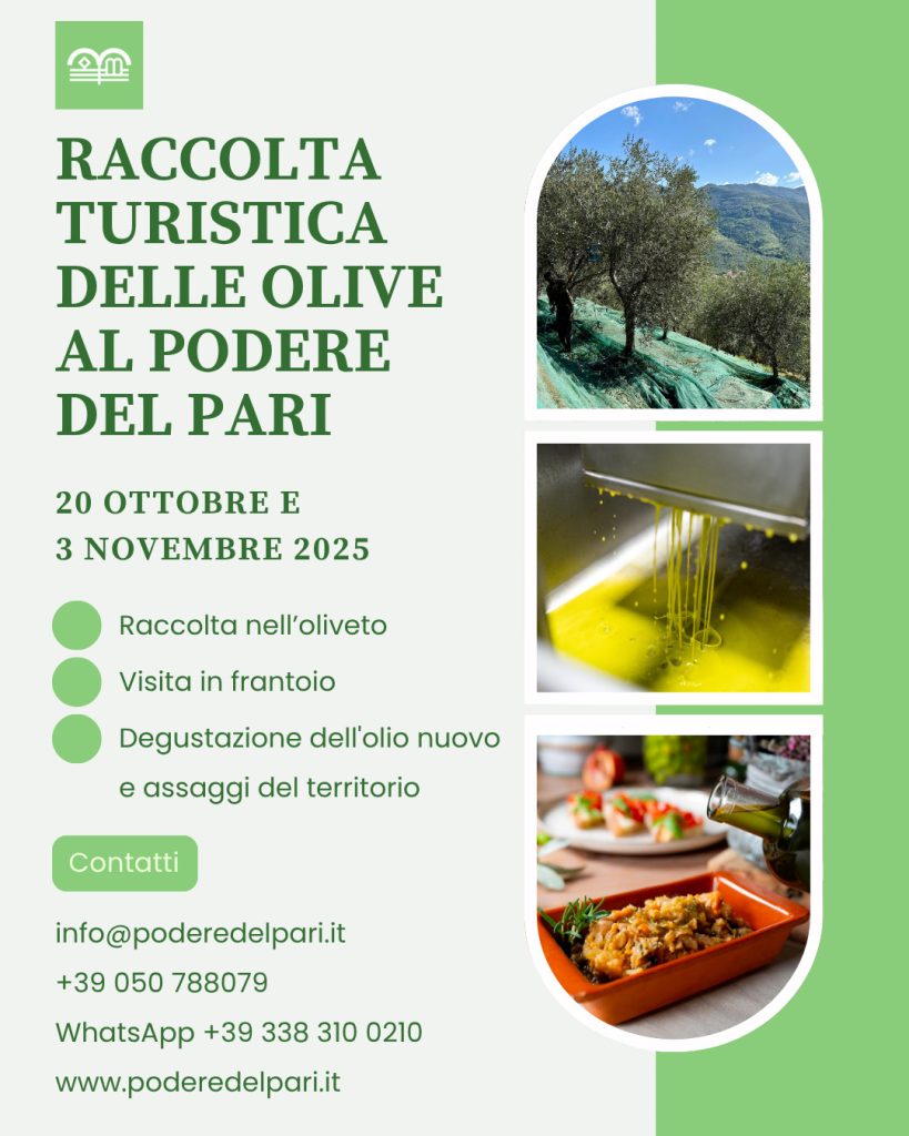 Questa esperienza si affianca alle consuete camminate tra gli oliveti, alle degustazioni guidate e ai percorsi di scoperta del territorio di Calci svolte dal Podere Del Pari.