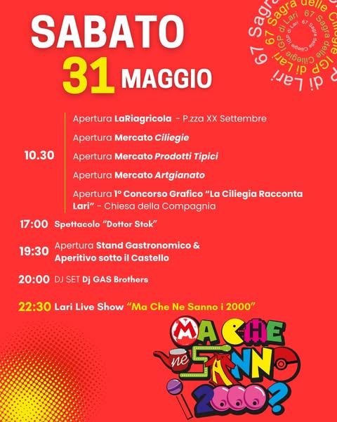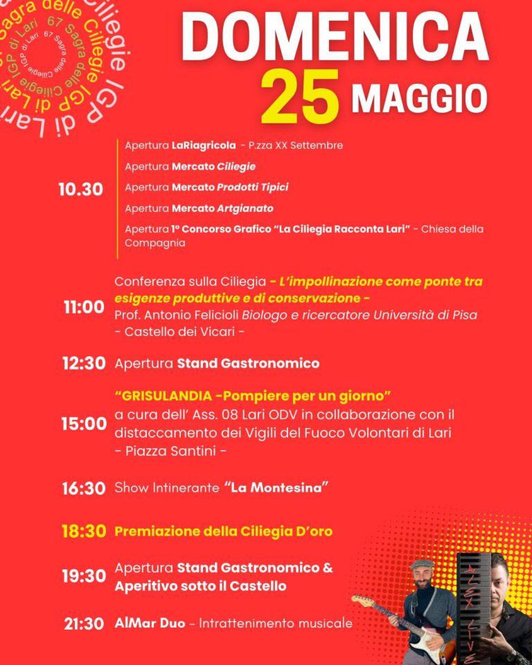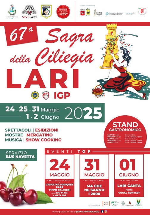 Torna la tradizionale sagra della ciliegia di Lari, che taglia il traguardo delle 67 edizioni. Da segnarsi le date di due fine settimana: 24-25 maggio – 31 maggio – 1 e 2 giugno, quando il centro storico di Lari è pronto ad accogliere i visitatori con la mostra mercato dei produttori.