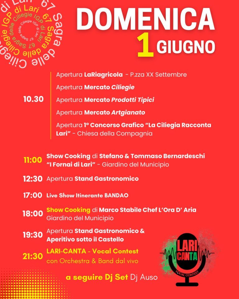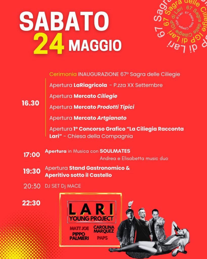 La sagra si svolge per due fine settimana con un programma ricco di eventi: grande risalto viene dato al mercato della Ciliegia di Lari e al mercato dei prodotti enogastronomici locali.