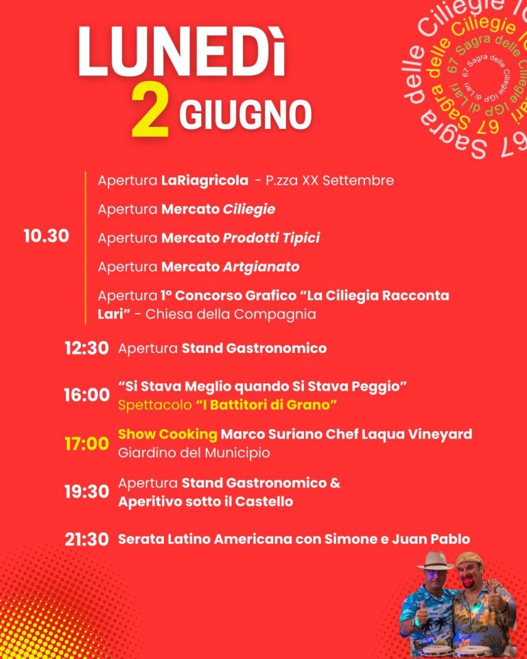 Saranno giornate all’insegna del gusto e dell’arte, alla scoperta delle eccellenze gastronomiche e del Castello dei Vicari. Sarà possibile assaporare l’antico e prelibato frutto della ciliegia, che da sempre rende unico il territorio con le sue 14 varietà autoctone, riconosciute dal Ministero a marchio IGP.