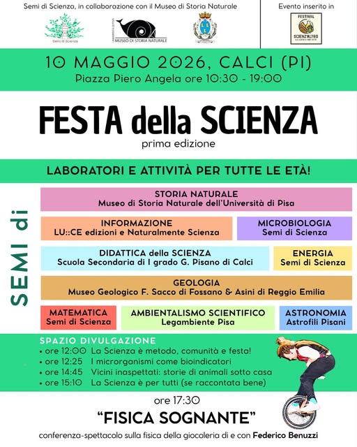 | Il 10 maggio, in Piazza Piero Angela a Calci, la prima edizione della Festa della Scienza, un evento di divulgazione scientifica rivolto a grandi e piccoli, in collaborazione con il Museo di Storia Naturale dell’Università di Pisa.