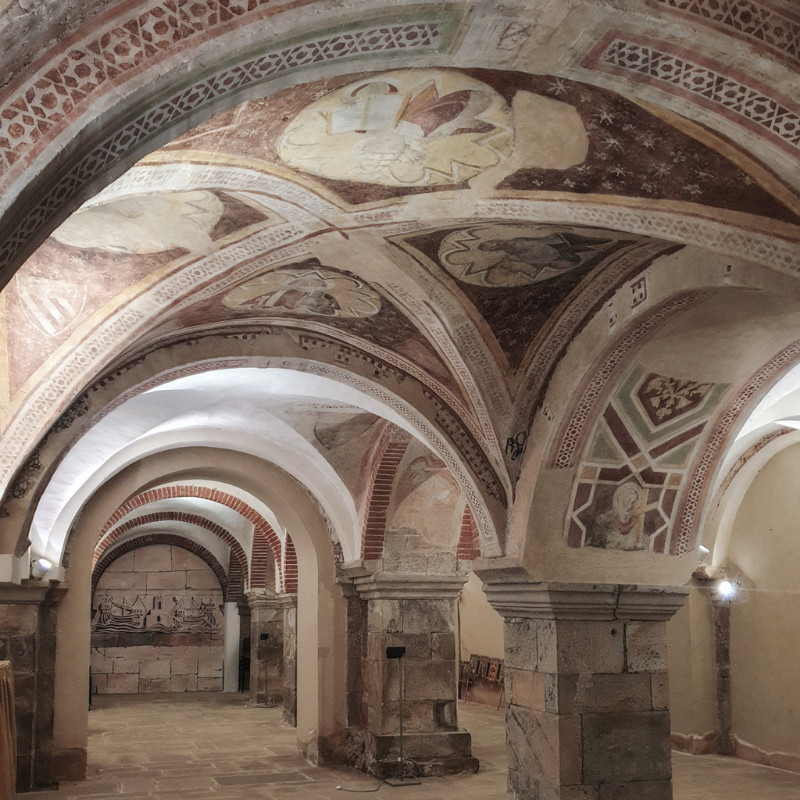 Si sviluppa su quattro navate con volte a crociera in parte arricchite da affreschi del Trecento. La cripta era anticamente utilizzata come cimitero, tanto che su alcune colonne si leggono ancora i nomi dei sepolti.